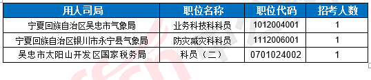 截止到20日16時,工作地點在寧夏的職位共有3個無人報考。下面是無人報考職位一覽表,中公網校專家建議廣大考生多關注一些較冷職位,避免激烈競爭,結合自身條件,找到屬于自己的職位。