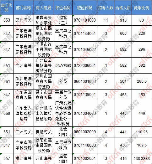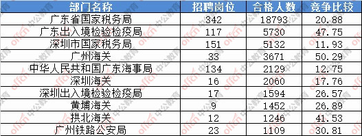 報名通過審核人數(shù)前十的職位主要集中在深圳海關(guān)、廣東省國家稅務(wù)局、廣州海關(guān),具體信息如下:
