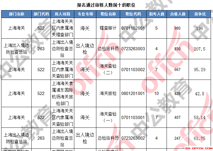 報(bào)名通過(guò)審核人數(shù)前十的職位主要集中在上海出上海海關(guān)、上海出入境邊防檢查總站、中國(guó)民用航空局華東地區(qū)管理局,具體信息如下: