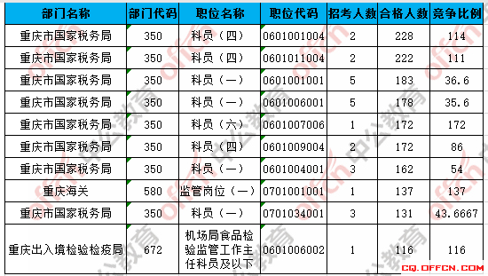 合格人數(shù)前十的職位主要集中在重慶市國家稅務局、重慶海關、重慶出入境檢驗檢疫局等部門,具體信息如下:
