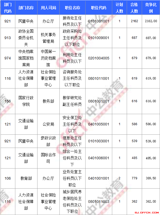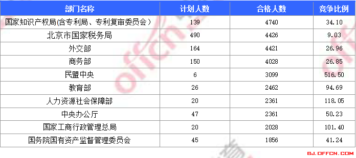 為幫助廣大考生更清晰的了解今日?qǐng)?bào)名情況,北京中公網(wǎng)校整理了合格人數(shù)前十位的部門以及競(jìng)爭(zhēng)比例最激烈的十大部門,供廣大考生參考: