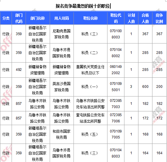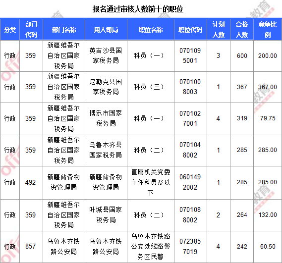 報(bào)名通過(guò)審核人數(shù)前十的職位主要集中在中公網(wǎng)校維吾爾自治區(qū)國(guó)家稅務(wù)局、中公網(wǎng)校儲(chǔ)備物資管理局、烏魯木齊鐵路公安局部門,具體信息如下: