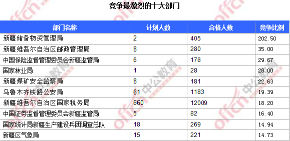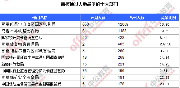 為幫助廣大考生更清晰的了解今日?qǐng)?bào)名情況,中公網(wǎng)校中公網(wǎng)校整理了審核通過(guò)人數(shù)前十位的部門以及競(jìng)爭(zhēng)比例最激烈的十大部門,供廣大考生參考: