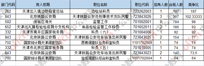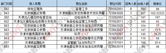 報(bào)名通過(guò)審核人數(shù)前十的職位主要集中在保稅區(qū)海關(guān)、北京鐵路公安局、天津出入境邊防檢查總站,具體信息如下:
