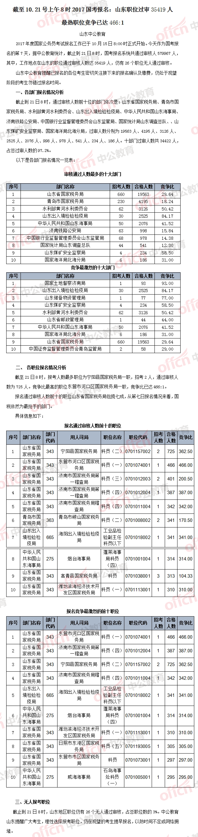 【截至21日8時】2017國考報名山東職位過審35419人 最熱職位競爭已達466:1