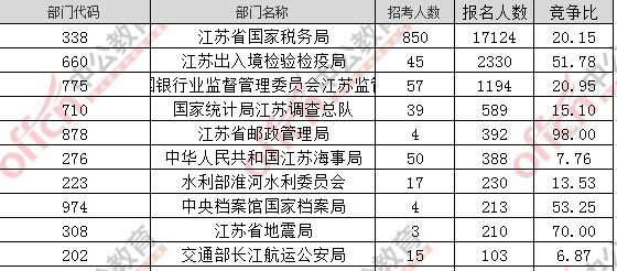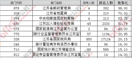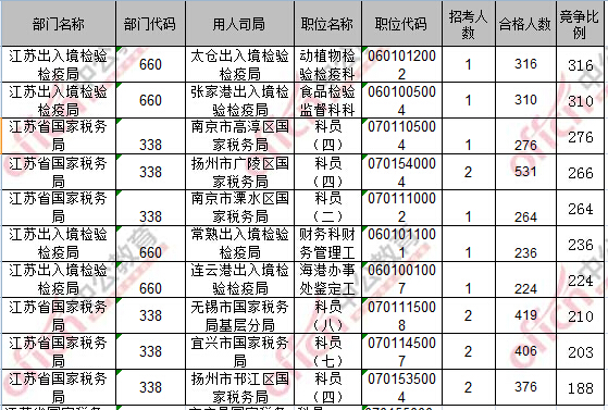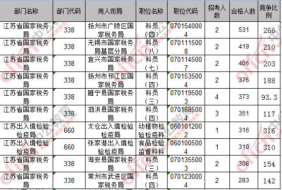 報名通過審核人數(shù)前十的職位主要集中在江蘇省國家稅務(wù)局、江蘇出入境檢驗檢疫局,具體信息如下: