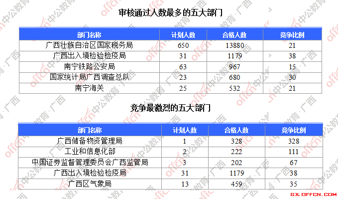 為幫助廣大考生更清晰的了解今日報(bào)名情況,廣西中公網(wǎng)校整理了審核通過人數(shù)前五位的部門以及競爭比例最激烈的五大部門,供廣大考生參考: