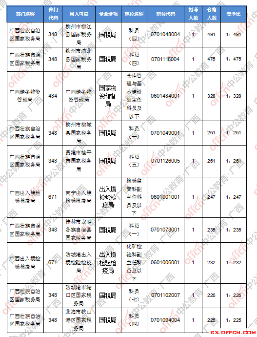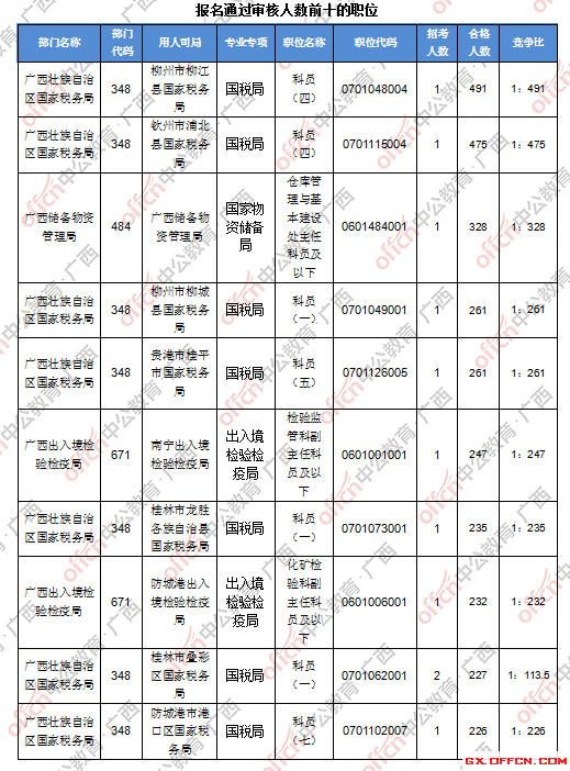報(bào)名通過審核人數(shù)前十的職位主要集中在廣西壯族自治區(qū)國家稅務(wù)局、廣西儲備物資管理局、廣西出入境檢驗(yàn)檢疫局等部門,具體信息如下: