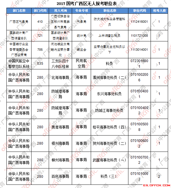 截止到21日16時,工作地點在廣西的職位共有18個無人報考,占全部職位的2.8%。下面是部分廣西無人報考職位一覽表,廣西中公網(wǎng)校專家建議廣大考生結(jié)合自身條件,根據(jù)自己的實際情況找到屬于自己的職位,避免激烈競爭。