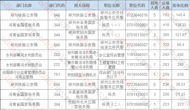 報名通過審核人數排名前列的職位主要集中在鄭州鐵路公安局、河南省國家稅務局,水利部黃河水利委員會,具體信息如下: