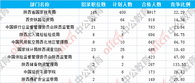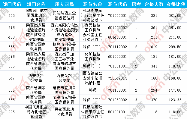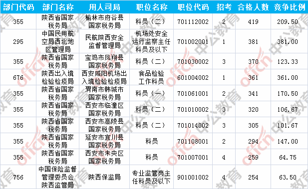 報(bào)名通過審核人數(shù)前十的職位主要集中在陜西出入境檢驗(yàn)檢疫局、陜西省國(guó)家稅務(wù)局、中國(guó)民用航空局西北地區(qū)管理局等部門,具體信息如下: