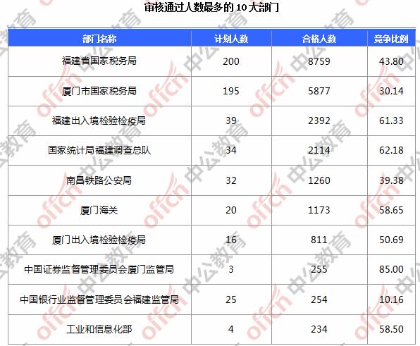 截止到21日16時(shí),通過(guò)審核人數(shù)前三位的部門依次是:福建省國(guó)家稅務(wù)局、廈門市國(guó)家稅務(wù)局、福建出入境檢驗(yàn)檢疫局,三部門通過(guò)審核總?cè)藬?shù)達(dá)17028人,占通過(guò)審核總?cè)藬?shù)的72%。
