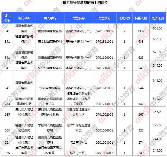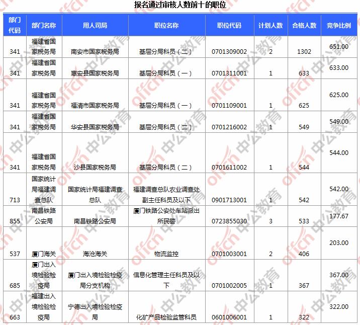報(bào)名通過(guò)審核人數(shù)前十的職位主要集中在南安市國(guó)家稅務(wù)局、惠安縣國(guó)家稅務(wù)局、福清市國(guó)家稅務(wù)局等部門,具體信息如下: