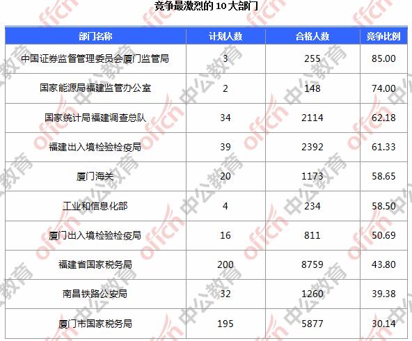 為幫助廣大考生更清晰的了解今日?qǐng)?bào)名情況,福建中公網(wǎng)校整理了審核通過(guò)人數(shù)前10位的部門以及競(jìng)爭(zhēng)比例最激烈的10大部門,供廣大考生參考:
