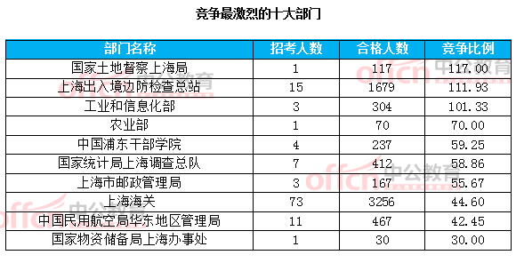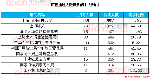 為幫助廣大考生更清晰的了解今日報名情況,上海中公網(wǎng)校整理了審核通過人數(shù)前十位的部門以及競爭比例最激烈的十大部門,供廣大考生參考: