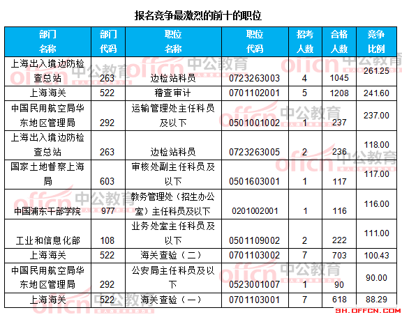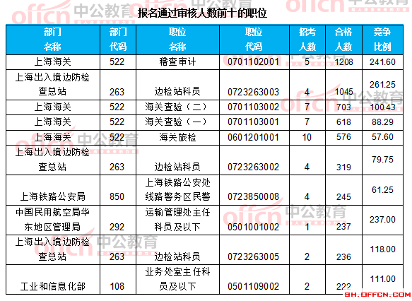 報名通過審核人數(shù)前十的職位主要集中在上海出入境邊防檢查總站、上海海關(guān)、上海鐵路公安局等部門,具體信息如下:
