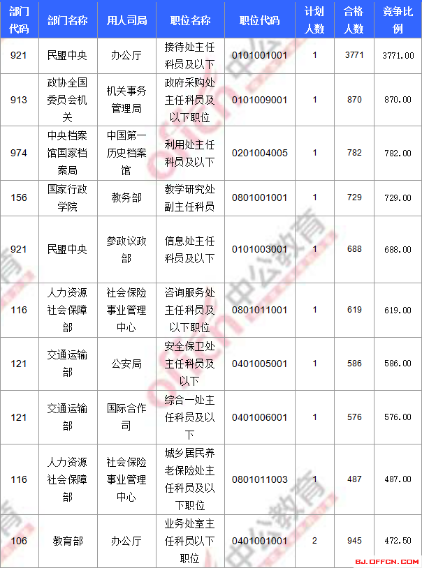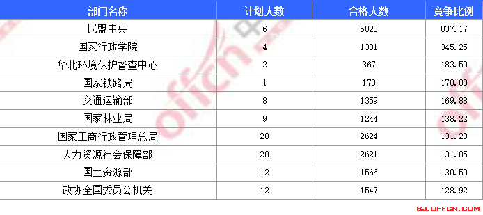 為幫助廣大考生更清晰的了解今日報名情況,北京中公網(wǎng)校整理了合格人數(shù)前十位的部門以及競爭比例最激烈的十大部門,供廣大考生參考: