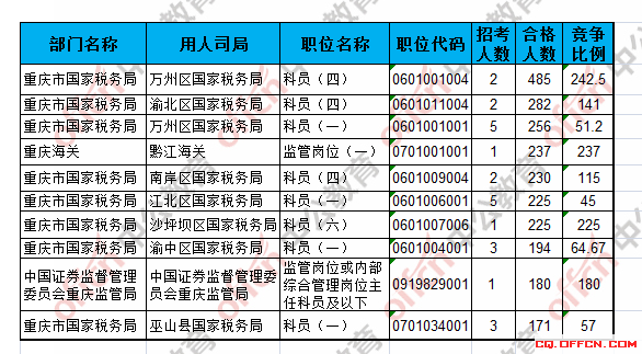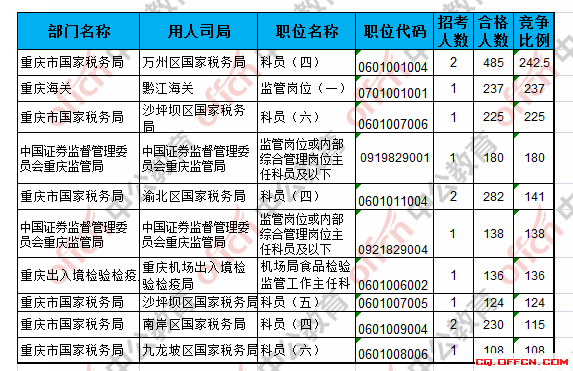 報(bào)名通過(guò)審核人數(shù)前十的職位主要集中在萬(wàn)州區(qū)國(guó)家稅務(wù)局、渝北區(qū)國(guó)家稅務(wù)局、黔江海關(guān)等部門(mén),具體信息如下: