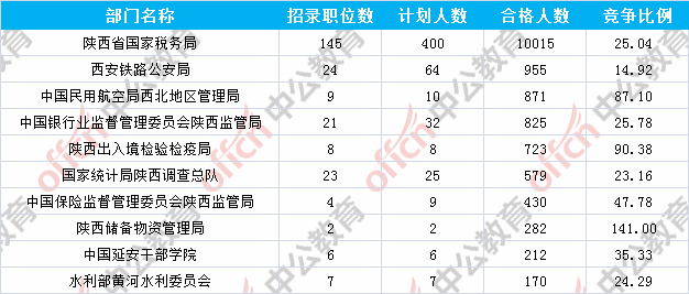 為幫助廣大考生更清晰的了解今日報名情況,陜西中公教育整理了審核通過人數(shù)前十位的部門以及競爭比例最激烈的十大部門,供廣大考生參考: