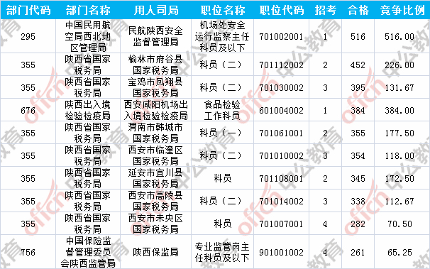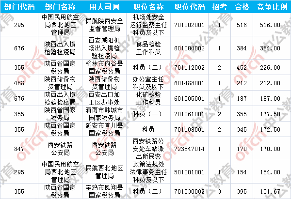 報名通過審核人數(shù)前十的職位主要集中在陜西出入境檢驗檢疫局、陜西省國家稅務(wù)局、中國民用航空局西北地區(qū)管理局等部門,具體信息如下: