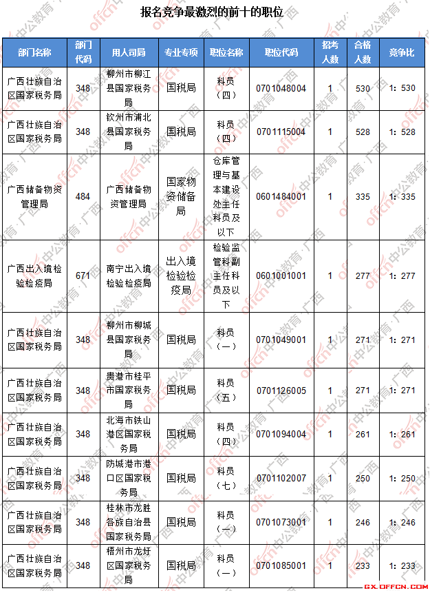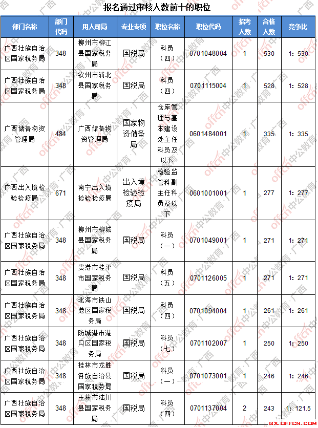 報名通過審核人數(shù)前十的職位主要集中在廣西壯族自治區(qū)國家稅務局、廣西儲備物資管理局、廣西出入境檢驗檢疫局等部門,具體信息如下: