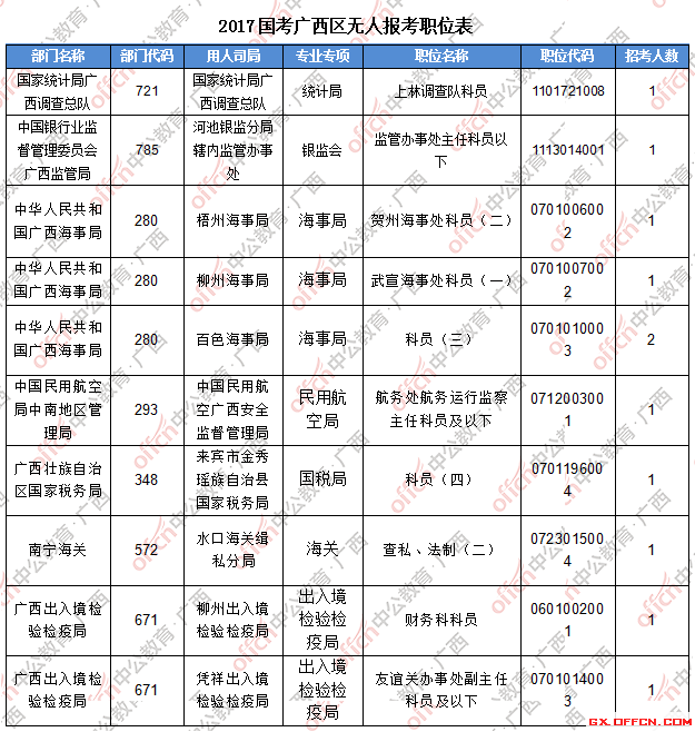 截止到22日8時,工作地點在廣西的職位共有10個無人報考,僅占全部職位的1.6%。下面是部分廣西無人報考職位一覽表,廣西中公教育專家建議廣大考生結合自身條件,根據(jù)自己的實際情況找到屬于自己的職位,避免激烈競爭。
