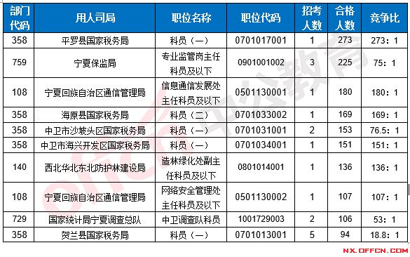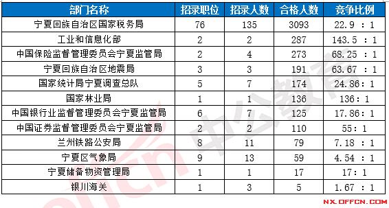 截至22日8時,據(jù)寧夏中公教育統(tǒng)計,2017國考招錄職位中工作地點在寧夏的職位審核合格總?cè)藬?shù)為4549人,所有職位均有人報考,其中6職位競爭比低于面試比例,平均競爭比例為28.8:1 。