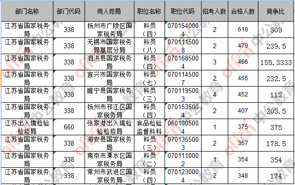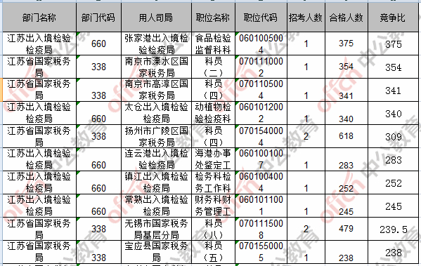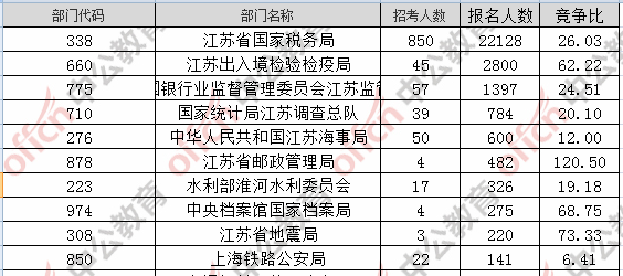 報(bào)名通過審核人數(shù)前十的職位主要集中在江蘇省國家稅務(wù)局、江蘇出入境檢驗(yàn)檢疫局,具體信息如下: