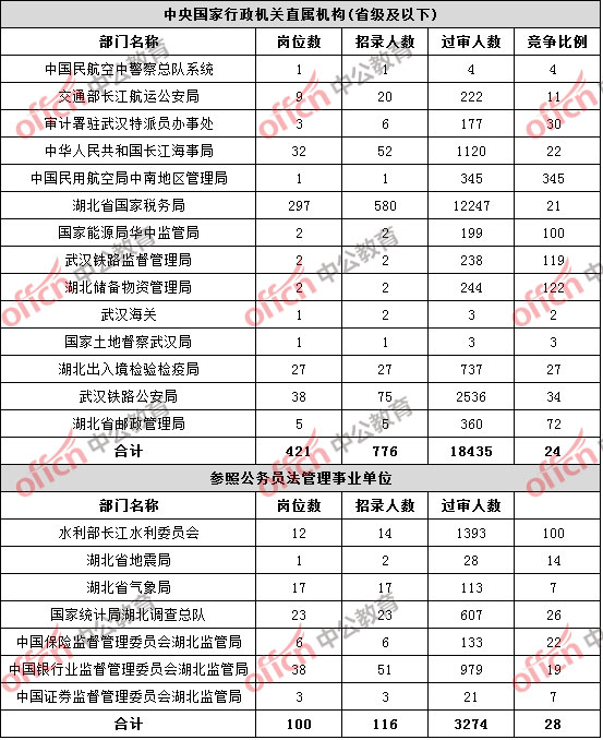截止到22日8時(shí),通過(guò)審核人數(shù)前三位的部門依次是:湖北省國(guó)家稅務(wù)局、武漢鐵路公安局、水利部長(zhǎng)江水利委員會(huì),三部門通過(guò)審核總?cè)藬?shù)達(dá)16176人,占通過(guò)審核總?cè)藬?shù)的74.51%,各部門招錄情況如下: