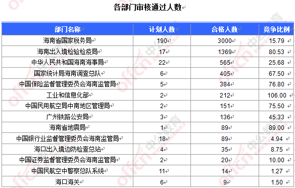 截止到22日16時,通過審核人數(shù)前三位的部門依次是:海南省國家稅務(wù)局、海南出入境檢驗檢疫局、中華人民共和國海南海事局,三部門通過審核總?cè)藬?shù)達4934人,占通過審核總?cè)藬?shù)的76.2%。