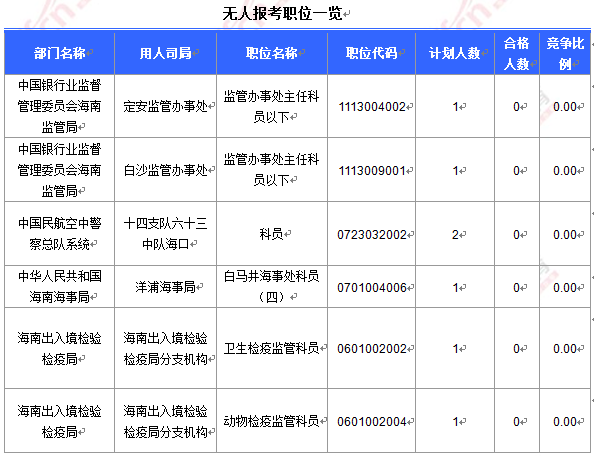 報名通過審核人數(shù)前十的職位主要集中在海南出入境檢驗檢疫局、海南省國家稅務(wù)局、中華人民共和國海南海事局等部門,具體信息如下: