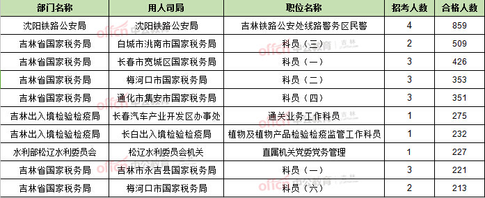 報名通過審核人數(shù)前十的職位主要集中在吉林省國稅局和吉林出入境檢驗檢疫局,具體信息如下:
