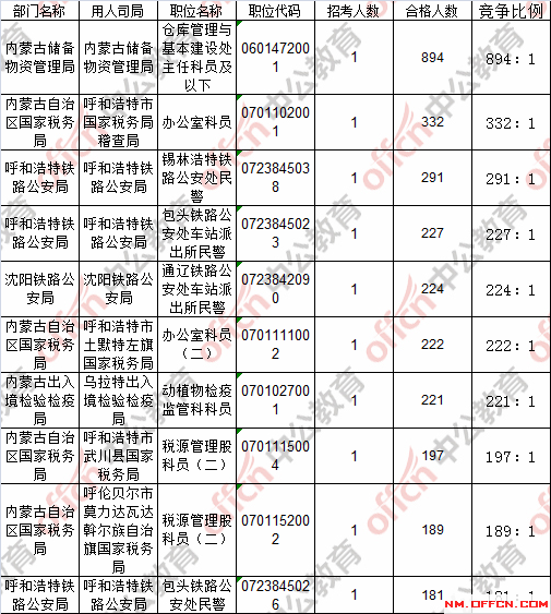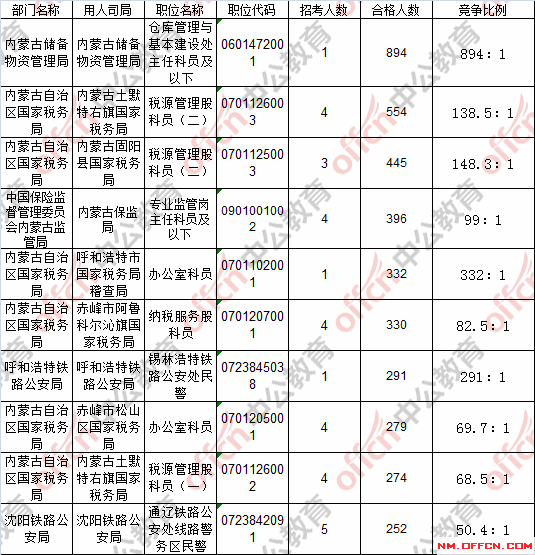 報(bào)名通過審核人數(shù)前十的職位主要集中在內(nèi)蒙古儲備物資管理局、內(nèi)蒙古固陽縣國家稅務(wù)局、內(nèi)蒙古土默特右旗國家稅務(wù)局等部門,具體信息如下: