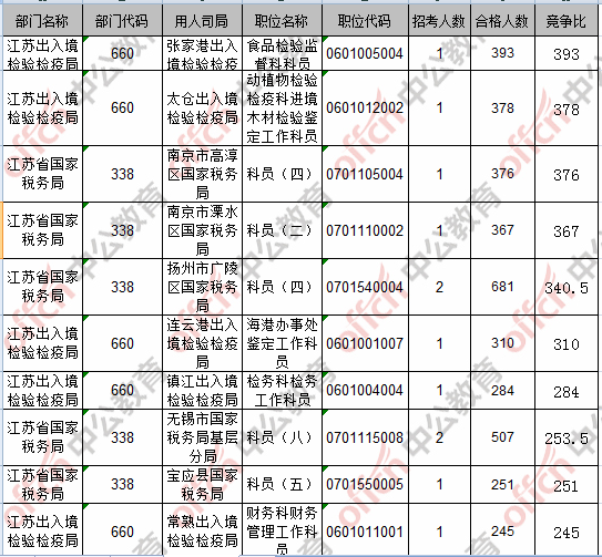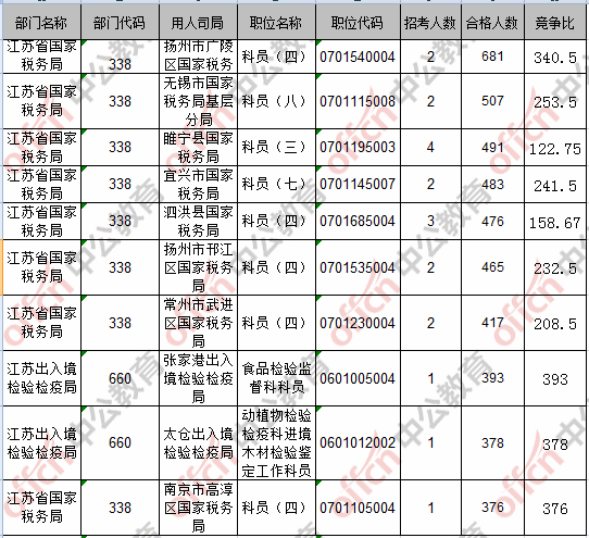 報名通過審核人數(shù)前十的職位主要集中在江蘇省國家稅務(wù)局、江蘇出入境檢驗檢疫局,具體信息如下: