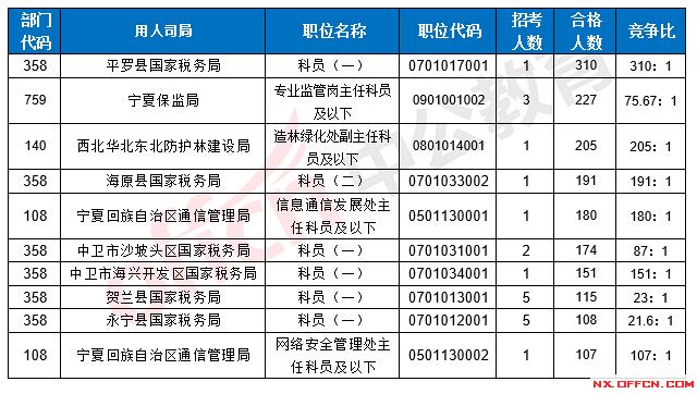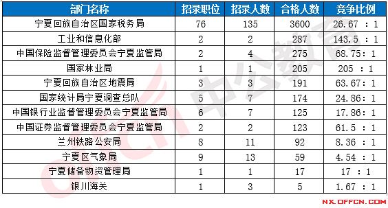 截至22日16時,據(jù)寧夏中公教育統(tǒng)計(jì),2017國考招錄職位中工作地點(diǎn)在寧夏的職位審核合格總?cè)藬?shù)為5153人,比去年同期報考人數(shù)減少225人,所有職位均有人報考,其中5職位競爭比低于面試比例,平均競爭比例為33.3:1 。