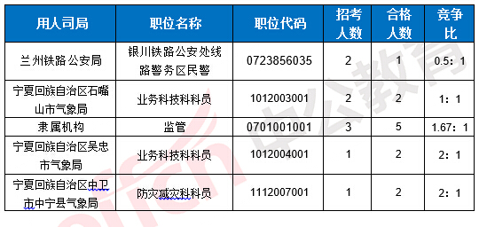 截止到22日16時,工作地點(diǎn)在寧夏的職位均有人報考,其中5職位競爭比低于面試比例。下面是爭比例低于面試比例職位一覽表,中公教育專家建議廣大考生多關(guān)注一些較冷職位,避免激烈競爭,結(jié)合自身?xiàng)l件,找到屬于自己的職位。