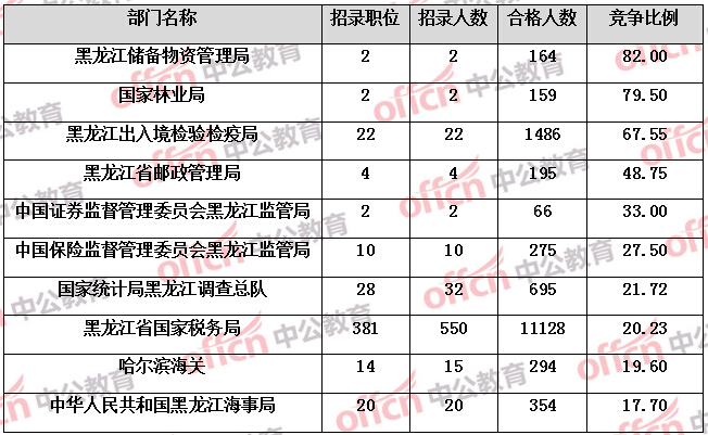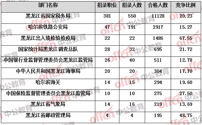 為幫助廣大考生更清晰的了解今日報名情況,黑龍江中公教育整理了審核通過人數前六位的部門以及競爭比例最激烈的十大部門,供廣大考生參考: