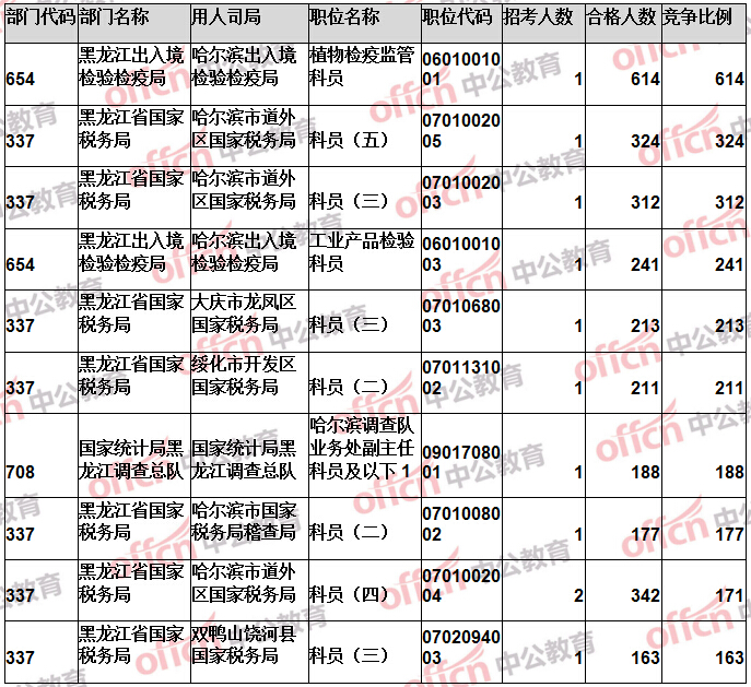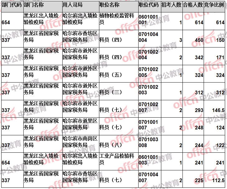 報(bào)名通過審核人數(shù)前十的職位主要集中在黑龍江省國(guó)家稅務(wù)局、黑龍江出入境檢驗(yàn)檢疫局、哈爾濱鐵路公安局等部門,具體信息如下: