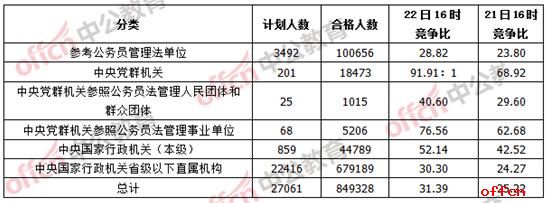 據(jù)中公教育數(shù)據(jù)統(tǒng)計(jì),截至22日16時(shí),經(jīng)過(guò)了近8天的報(bào)名后,報(bào)名系統(tǒng)已經(jīng)審核通過(guò)了849328人,超出去年同期5萬(wàn)人左右,平均競(jìng)爭(zhēng)比為31.38:1,高出去年同期的28.8:1。從單日增長(zhǎng)量來(lái)看,較21日下午同期增加了166899人。從各系統(tǒng)來(lái)看,中央黨群機(jī)關(guān)競(jìng)爭(zhēng)比,已達(dá)到91.91:1。目前仍有490個(gè)崗位報(bào)考人數(shù)還未破零,占3.14%。