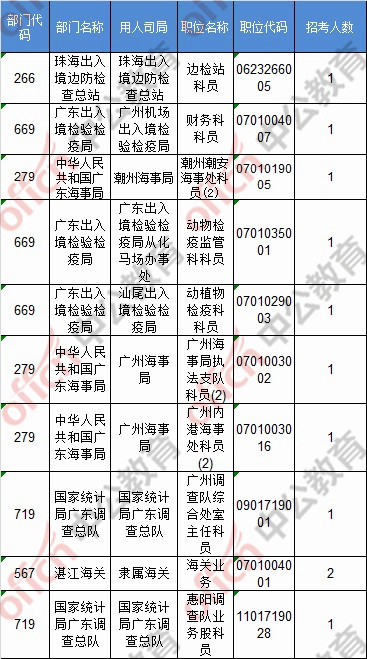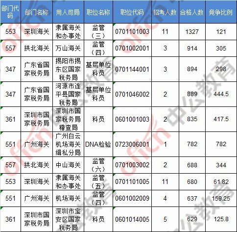 報名通過審核人數(shù)前十的職位主要集中在深圳海關(guān)、拱北海關(guān)、廣東省國家稅務(wù)局,具體信息如下: