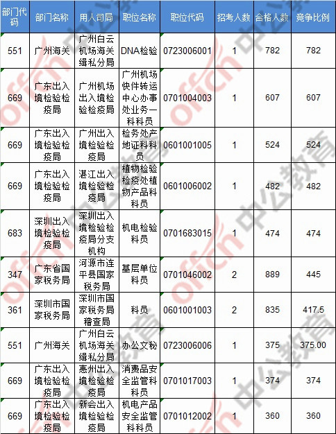 截止到23日8時,競爭比例的職位為廣州海關(guān)廣州白云機場海關(guān)緝私分局DNA檢驗一職,招錄1人,截止到23日8時通過人數(shù)為782人。
