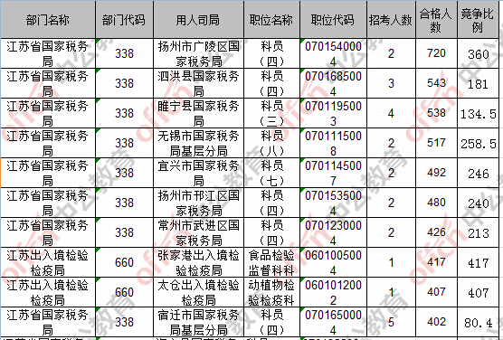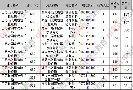 截至23日8時(shí),競(jìng)爭(zhēng)比例的職位為江蘇出入境檢驗(yàn)檢疫局張家港出入境檢驗(yàn)檢疫局食品檢驗(yàn)監(jiān)督科科員一職,招錄1人,截至23日8時(shí)通過(guò)人數(shù)為417人。