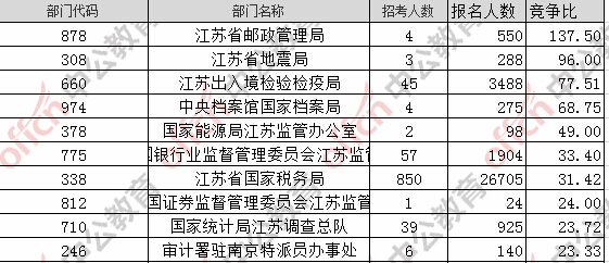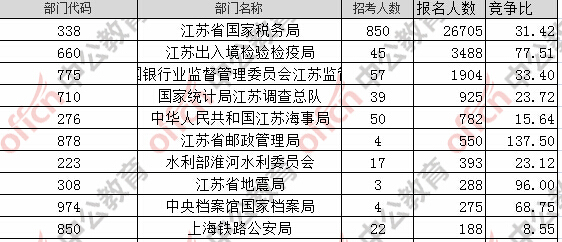 報(bào)名通過(guò)審核人數(shù)前十的職位主要集中在江蘇省國(guó)家稅務(wù)局、江蘇出入境檢驗(yàn)檢疫局,具體信息如下: