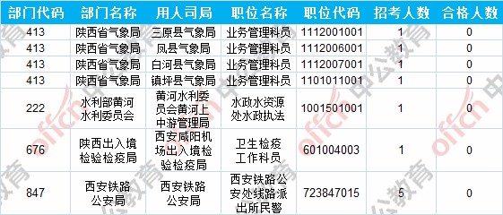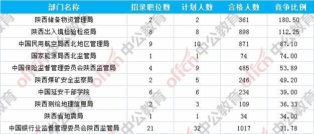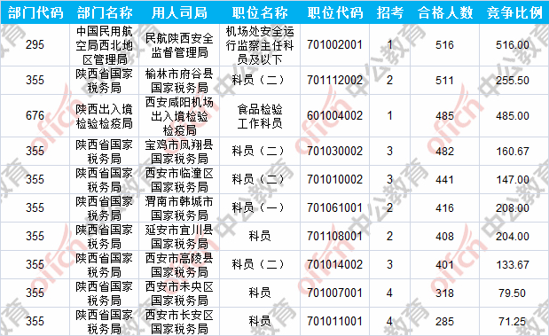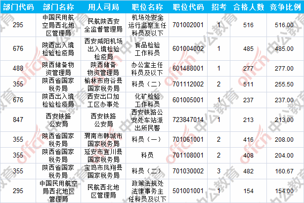 報(bào)名通過(guò)審核人數(shù)前十的職位主要集中在陜西出入境檢驗(yàn)檢疫局、陜西省國(guó)家稅務(wù)局、中國(guó)民用航空局西北地區(qū)管理局等部門,具體信息如下: