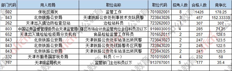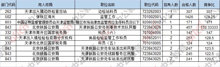 報名通過審核人數(shù)前十的職位主要集中在保稅區(qū)海關(guān)、北京鐵路公安局、天津出入境邊防檢查總站,具體信息如下: