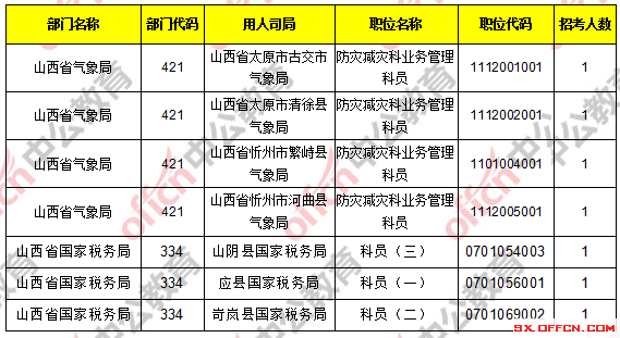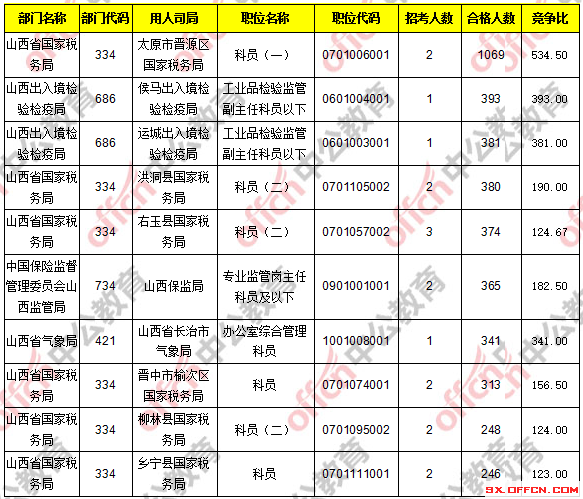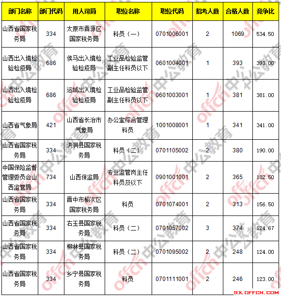 報(bào)考人數(shù)前十的職位主要集中在山西省國(guó)家稅務(wù)局、山西出入境檢驗(yàn)檢疫局這兩個(gè)部門,具體信息如下:
