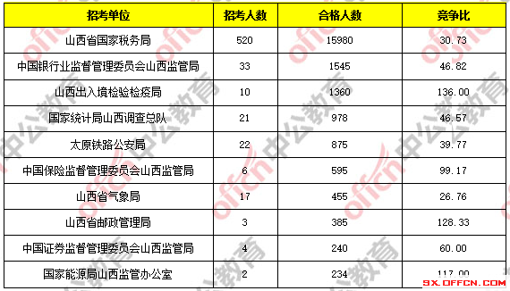 為幫助廣大考生更清晰的了解今日?qǐng)?bào)名情況,山西中公網(wǎng)校整理了合格人數(shù)前十位的部門以及競(jìng)爭(zhēng)比例最激烈的十大部門,供廣大考生參考: