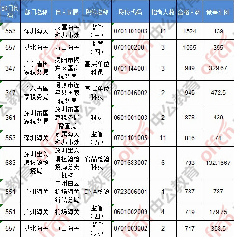報(bào)名通過(guò)審核人數(shù)前十的職位主要集中在深圳海關(guān)、拱北海關(guān)、廣東省國(guó)家稅務(wù)局,具體信息如下: