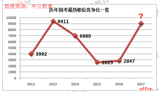 從下圖的歷年國考最熱職位競爭比一覽圖中可清晰看出,從2012年至2016年,最熱職位峰出現(xiàn)在2013年國家統(tǒng)計局重慶調查總隊(1003722006)一職的9411:1,接近"萬里挑一"。而今年最熱職位現(xiàn)在已達到7555:1,這是2013年后,出現(xiàn)的再一個"高峰",但因今年報名還有明日一天的時間,今年國考最熱職位究竟能爬上多高的"峰值",給我們帶來多大的"驚喜",讓我們在明日"拭目以待"。