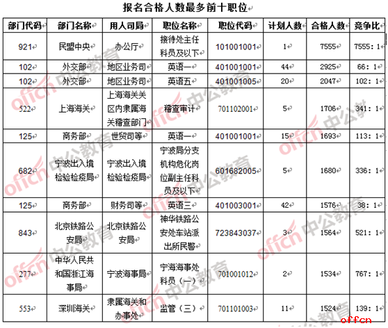 來自民盟中央辦公廳接待處主任科員及以下(職位代碼為101001001)一職繼續(xù)"霸占"最熱職位的"頭把交椅",巋然不動,該職位招錄1人,目前過審人數(shù)為7555人,今日增長1000余人,增幅較前兩日有所放緩,但此職位在一個周末2日的時間內增長3784人,其中不排除"上班族"對國考的"滿腔熱情",還有一個重要原因就是報名已近尾聲,持"觀望"態(tài)度的考生終于開始"下手",不排除有相當一部分是為熟悉國考的導向以及考試氛圍,為來年的省考做準備的考生。